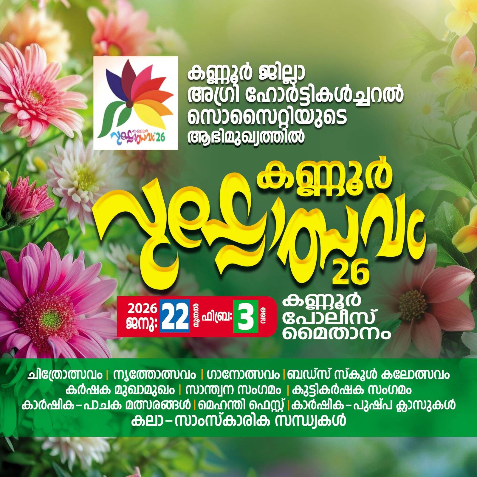 കണ്ണൂർ :ജില്ലാ അഗ്രി ഹോർട്ടികൾച്ചർ സൊസൈറ്റി പൊലീസ് മൈതാനിയിൽ സംഘടിപ്പിക്കുന്ന കണ്ണൂർ പുഷ്പോത്സവം വ്യാഴം വൈകിട്ട് ആറിന് കഥാകൃത്ത് ടി പത്മനാഭൻ ഉദ്ഘാടനം ചെയ്യും.