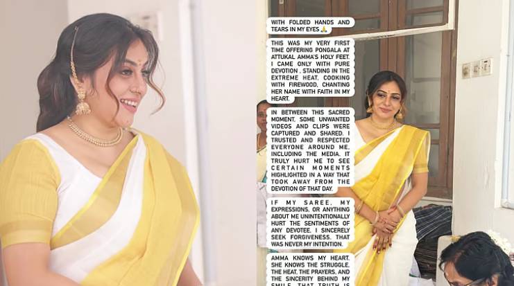 തന്റെ ഭക്തിയെ തെറ്റായ രീതിയിൽ ചിത്രീകരിക്കുന്ന തരത്തിൽ ചില ദൃശ്യങ്ങൾ എടുത്തുകാട്ടി പ്രചരിപ്പിക്കുന്നത് കണ്ടപ്പോൾ ഒരുപാട് വിഷമം തോന്നിയതായി നടി സമൂഹമാധ്യമങ്ങളിൽ കുറിച്ചു. തന്റെ വസ്ത്രധാരണമോ, ഭാവങ്ങളോ, മറ്റെന്തെങ്കിലുമോ ഏതെങ്കിലും ഭക്തരുടെ വികാരങ്ങളെ അറിഞ്ഞോ അറിയാതെയോ വ്രണപ്പെടുത്തിയിട്ടുണ്ടെങ്കിൽ ആത്മാർത്ഥമായി മാപ്പപേക്ഷിക്കുന്നതായി നടി അറിയിച്ചു